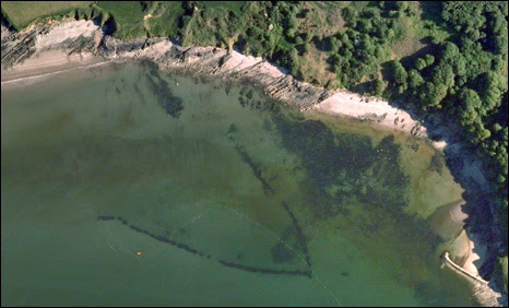 A large medieval fish trap has been found in an estuary in Pembrokeshire, Wales, after it was spotted in aerial photographs on Google Earth. The 260m (853ft) man-made V-shaped structure could be more than 1,000 years old, experts believe.